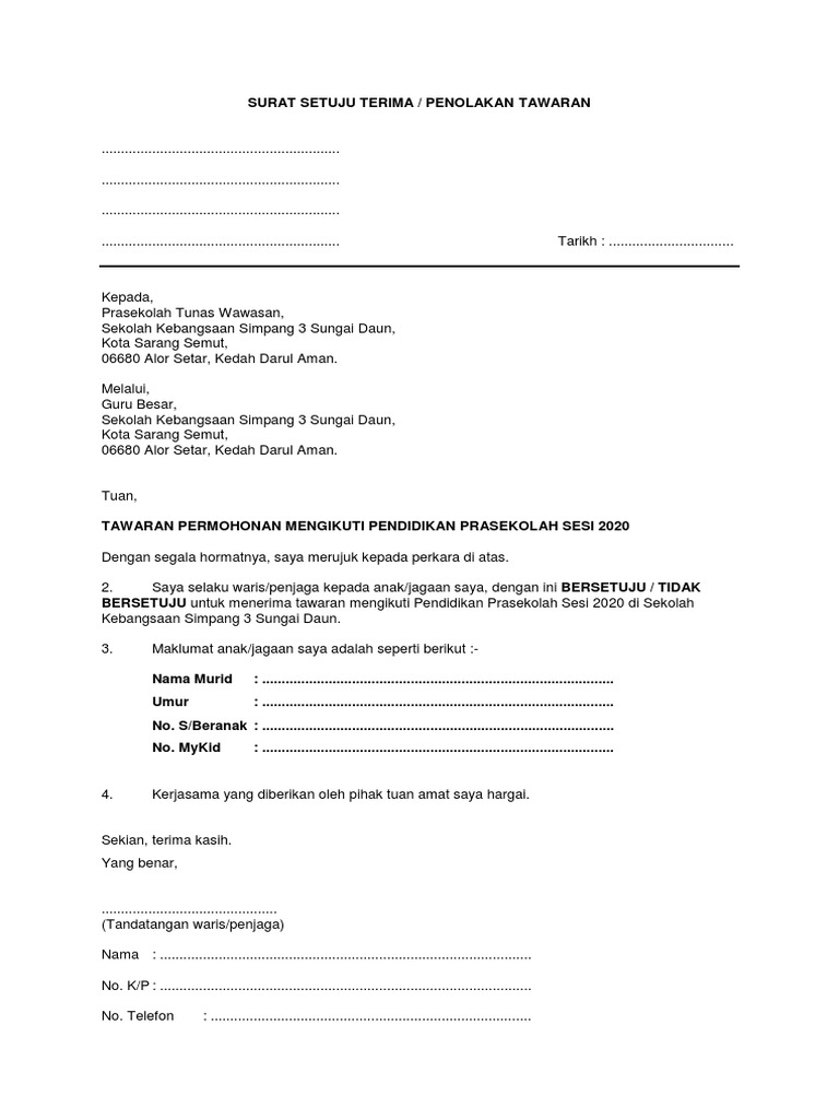 Ibu bapa penjaga anak yang lahir pada 2016 dan 2017 boleh buat permohonan daftar murid tahun 1 sekolah kerajaan. Sebelum mengirim tindasan penolakan pastikan sira tidak memerlukan pekerjaan. Surat Penolakan Tawaran Pra Sekolah.
